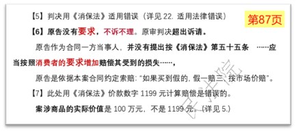 第一章 针对再审裁判的部分 依据《民事诉讼法》第二百一十一条 第(二)、(三)、(六)、(七)、(九)、(十三)项,向贵院提出民事监督申请。 (二)原判决、裁定认定的基本事实缺乏证据证明的; (1)【事实】《裁定书》第1-2页,“马宪春申请再审称:……根据《消保法》第五十五条规定,经营者提供商品或者服务有欺诈行为的,应当按照消费者的要求增加赔偿其受到的损失。” ||| 申请人没有这个观点,这是申请人反对的观点。 (2)【证据】 ① 《再审申请书》(全称《民事再审申请书终结版》)第55页,(六) 原判决、裁定适用法律确有错误的; 22. 一审判决“假一赔三”赔偿标准适用法律错误;(↓37. 法律错误) ![]()