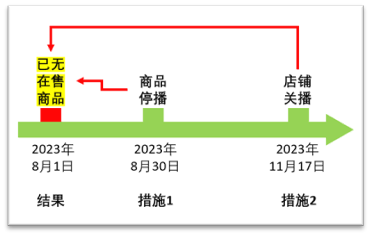 23. 截至本案诉讼时,案涉店铺已无在售商品____原审认定事实错误。 《判决书》第8,11页,本院认定事实如下:……“2023年8月30日,被告寻梦公司对涉案店铺采取资金冻结90天处罚措施,案涉商品停止直播;2023年11月17日,被告寻梦公司对涉案店铺扣分A类36分,关闭店铺直播功能。此外,被告寻梦公司还限制了涉案店铺资金提现。截至本案诉讼时,案涉店铺已无在售商品。” (1)关键词:认定的结果“已无在售商品”,结果时间“截至本案诉讼时”。 (2)《判决书》第14页,“原告于2023年8月1日在宁波起诉。” ||| 本案诉讼时间:2023年8月1日。 (3)原审认定原因的事实提到两个日期:8月30日“案涉商品停止直播”、11月17日“关闭店铺直播功能”。分别采取相应措施后,达到8月1日 “已无在售商品”的结果。时间——措施——效果(如图)。 (4)“措施”的时间均在“结果”立案日期8月1日之后,该两个时间被告的行为不能合理推导出8月1日之前的事实“已无在售商品”,事实应是刚好相反(有在售商品)。《判决书》第4页,“8月20日直播间宣称商品值一千万视频及文字版……”能够反证8月1日后仍有商品售卖。原审法官明显歪曲事实。 (5)自认反证:被告2《情况说明》表格还有显示(原审故意回避不引用)“违规时间:2023-11-17;本节违规原因:直播-不恰当宣传(严重)”。||| 说明11月17日被告1仍在直播并做“不恰当宣传”,否则不能有“本节违规”。自己否认了之前“已无在售商品”的结论。 店铺关播并不能直接导致无在售商品,因为还有店铺商品链接可以出售。 (7)【处分参考】 《人民法院工作人员处分条例》第四十三条 故意违背事实和法律枉法裁判的,给予降级或者撤职处分;情节严重的,给予开除处分。 |