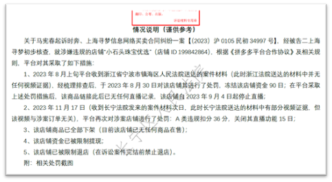5. 邓鑫法官编造伪证——平台对商家直播违规的处罚截图——反噬自身。 (1)从判决陈述看 《判决书》第8页,“被告寻梦公司为证明其主张,向法庭提交了……平台对商家直播违规的处罚截图等证据。”【认定错误事实】 【证据】 l 判决书引用标题:平台对商家直播违规的处罚截图(共三个名称) l 实际卷宗标题:被告2提交的平台对商家直播违规的处罚情况说明及附件; l 该材料内部标题:情况说明(谨供参考); 【分析】 ② 如果把《被告2提交的平台对商家直播违规的处罚情况说明及附件》当成此“证据”,也不是证据。 因为《~情况说明及附件》在卷宗目录《被告材料》——《被告及其代理人的书面意见》栏目下,并不在《被告举证材料》栏目下,所以说它不是证据。 属于偷换、伪造证据。 (2)从提交过程看 ① 不是证据 1)《笔录2》(证据交换笔录(2024.1.18))第11-12页, 2)据此可以推测:被告2只有“对直播录屏的情况说明”,是关于直播购物当天的直播情况说明,该说明核心应是“是一致的”,证明原告三段录屏证据真实。(完整应该四段,“断片”一段是第二段抢购过程,怕录屏影响速度抢不到,所以没录) 3)因为被告2自认“没有”证据提交。“对直播录屏的情况说明”不是证据。 4)第二次证据交换(2024.1.18)被告2无任何证据提交! ② 超期举证 被告2《情况说明》超过第一次庭审(2023年12月18日)法官给的第二次举证期限15天——2024年1月3日止。现在是第二次庭审(2024年 1月18日)。 ③ 庭上未采纳 本次庭审,法官对被告2拼多多《情况说明》没有“训诫或罚款”,应视为没有采纳《情况说明》作为证据。因为如果采纳超期证据,依法应进行“训诫或罚款”。 ④ 庭上未出示质证、辩论 《笔录2》没有任何质证、答辩记载。但《判决书》采信了此《情况说明》内容。没说明采信理由。违法采信。 被告2自己都说“谨供参考”,对核心“证据”有这样客气的吗?对自己的东西这么没有底气,也就是这个东西经不起推敲。证据就是证据,是希望法官采信而不是参考。那么邓鑫采信的理由是什么呢?没看到。 (4)从材料内容看 ①《情况说明》是被告2拼多多单方提供的陈述,文字叙述部分无对应的实质性证据证明。 (5)从证据属性看 被告单方提供的复印件,无相关佐证。不具有合法性、不具有真实性。 该证据没有单位印章、没有人员签名,不具有合法性。 综上,被告拼多多自己不认可的证据,邓鑫法官却拿它当做证据,伪造成证据。并依此“证据”使拼多多逃脱连带责任。 另 (6)原审采纳、采信了该《情况说明》大量内容↓,但未做解释。违法。 《判决书》第8页-,本院认定事实如下(来自《情况说明》):……(第12页)2023年8月30日,被告寻梦公司对涉案店铺采取资金冻结90天处罚措施,案涉商品停止直播;2023年11月17日,被告寻梦公司对涉案店铺扣分A类36分,关闭店铺直播功能。此外,被告寻梦公司还限制了涉案店铺资金提现。截至本案诉讼时,案涉店铺已无在售商品。||| 该部事实结论认定错误——“截至本案诉讼时,案涉店铺已无在售商品” ① “本案”指的是马宪春与时x、拼多多信息网络买卖合同纠纷案,该案2023年8月1日在宁波立案,后因拼多多提出管辖异议移送上海长宁法院。“本案诉讼时”是2023年是8月1日。 ② 而《情况说明》自认8月30日处罚、停播,足以自我否定“案涉店铺已无在售商品”(至少不能证明8月30日前“案涉店铺已无在售商品”);