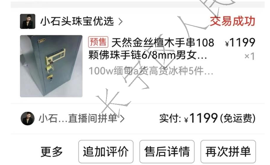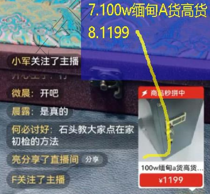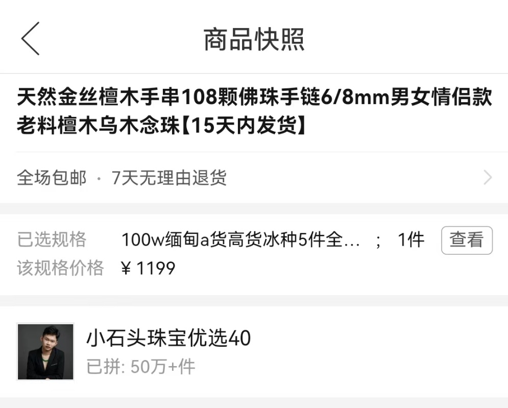 《监督决定书》错误认定和叙述的案件重要事实 4. 案涉商品的实际价值1199元——认定错误 ! 《决定书》 “因时x售假行为构成欺诈,应当按照案涉商品的实际价值1199元……” ||| 没有证据证明案涉商品的实际价值是1199元,有证据证明是100万元,证据证明1199元是价款。 (1)有证据证明案涉商品的实际价值为100万元。 ① 直播间右下角商品链接图显示100w(↑1. 第一个事实)。 《判决书》第8-10页,本院认定事实如下:……“直播间右下角商品图片下方有文字描述:商品秒拼中,100w缅甸a货高货…¥1199”。此100w,其作用相当于标的物商品的吊牌价、标牌价、标价、市场价、宣传价、实际价值等具体体现。 ② 商品快照、订单快照显示100w标价(↑1. 第一个事实)。 (2)法官明确审到了100w——真翡翠的价值。 《笔录2》第5-6页,