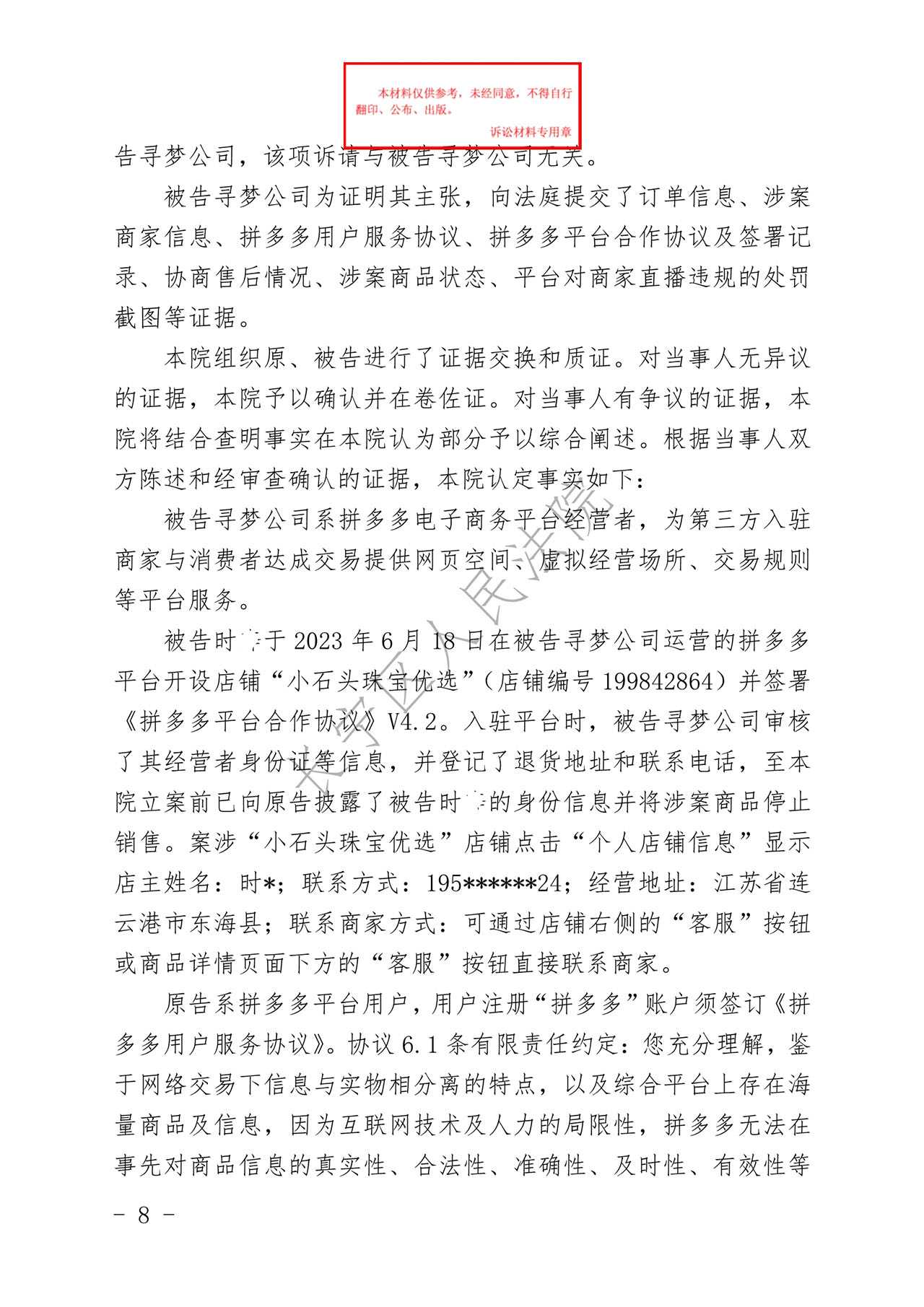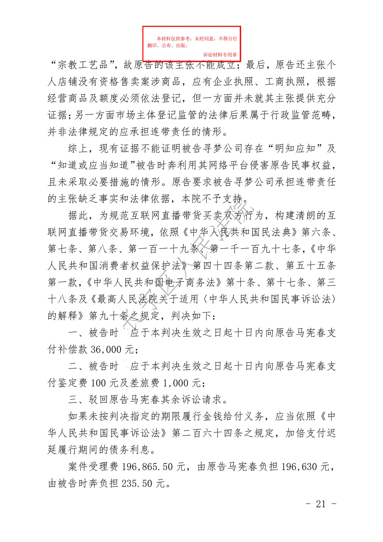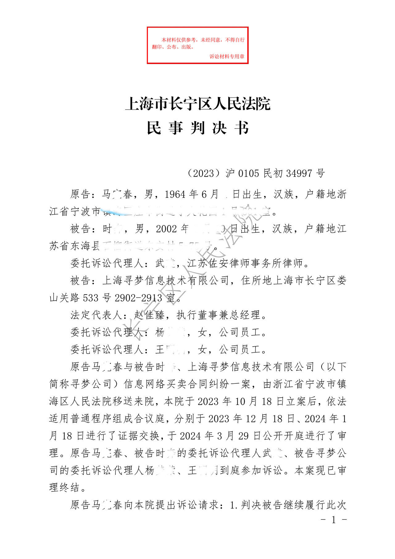 上海市长宁区人民法院民事判决书(2023)沪0105 民初34997号 原告马*春与被告时B、上海寻梦信息技术有限公司(以下简称寻梦公司)信息网络买卖合同纠纷一案,由浙江省宁波市镇海区人民法院移送来院,本院于2023年10月18日立案后,依法适用普通程序组成合议庭, 分别于2023年12月18日、2024年1月18日进行了证据交换,于2024年3月29日公开开庭进行了审理。原告马宪春、被告时B的委托诉讼代理人武J、被告寻梦公司的委托诉讼代理人杨MM、王MM到庭参加诉讼。本案现已审理终结。 原告马*春向本院提出诉讼请求: 1.判决被告继续履行此次【1页尾】 |